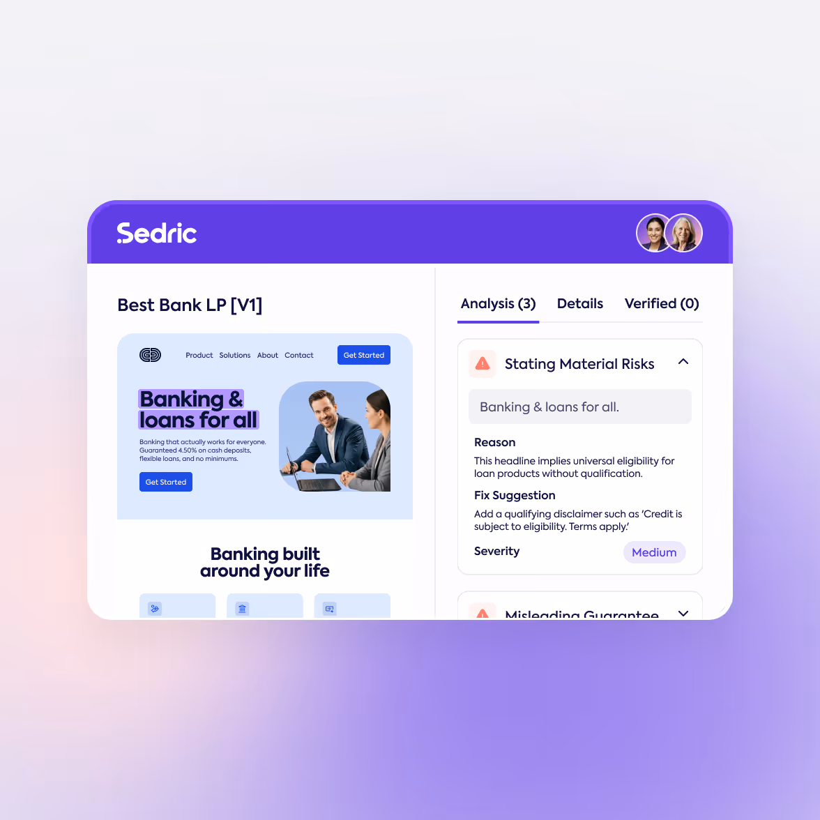 Sedric protects sensitive data and enforces strict controls to meet the security, privacy, and compliance requirements of regulated financial institutions.